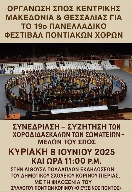 Ο Σύνδεσμος Ποντιακών Σωματείων Κεντρικής Μακεδονίας και Θεσσαλίας καλεί σε συνεδρίαση - συζήτηση των χοροδιδασκάλων των σωματείων μελών του, η οποία θα πραγματοποιηθεί την Κυριακή 8 Ιουνίου 2025 11:00 π.μ. στην αίθουσα πολλαπλών εκδηλώσεων του Δημοτικού Σχολείου στον Κορινό Πιερίας με την συνδρομή του Συλλόγου Ποντίων Κορινού (Ο Εύξεινος Πόντος).