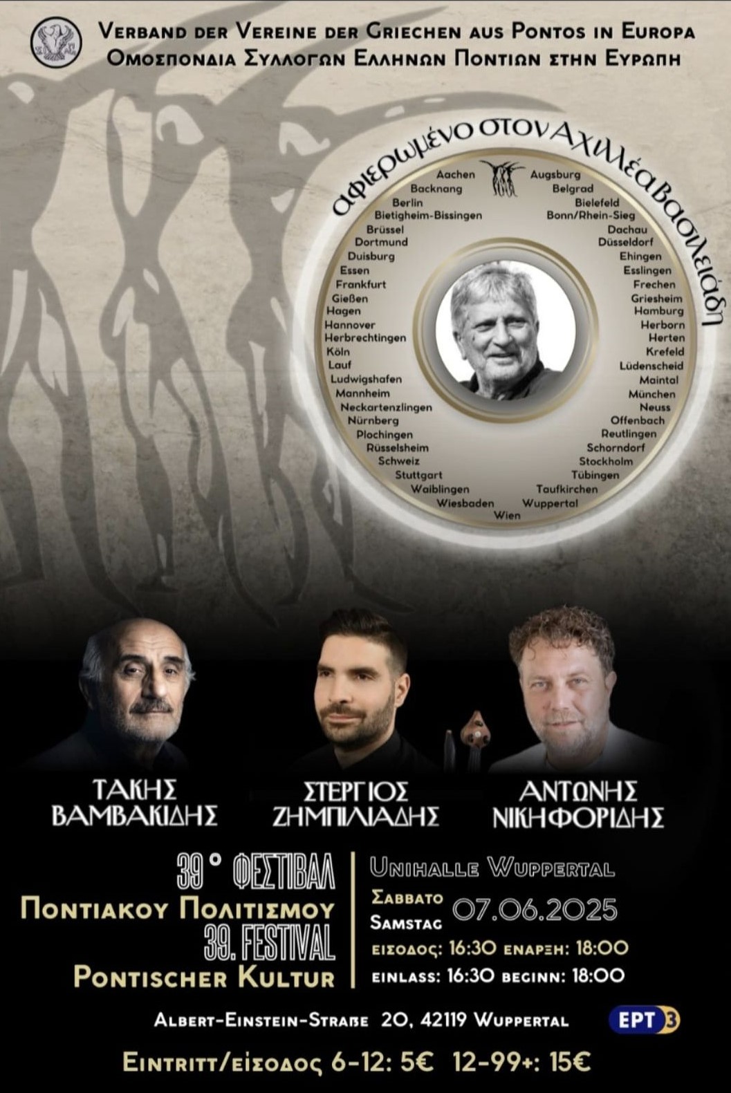 Το 39ο Φεστιβάλ Ποντιακού Πολιτισμού της Ομοσπονδίας Συλλόγων Ελλήνων Ποντίων στην Ευρώπη (ΟΣΕΠΕ), θα πραγματοποιηθεί το Σάββατο 7 Ιουνίου 2025, στο αθλητικό κέντρο εκδηλώσεων UNIHALLE WUPPERTAL, στο χώρο όπου έχει πραγματοποιηθεί και άλλες φορές, εκεί όπου σε προηγούμενα φεστιβάλ, παρουσιαστής των ποντιακών χορευτικών συγκροτημάτων ήταν ο αείμνηστος Αχιλλέας Βασιλειάδης, στυλοβάτης και αρωγός σε κάθε προσπάθεια της ΟΣΕΠΕ. Την εκδήλωση τιμούν με την παρουσίασή τους, η οικογένεια και οικείοι του αείμνηστου καλλιτέχνη του ποντιακού ελληνισμού.