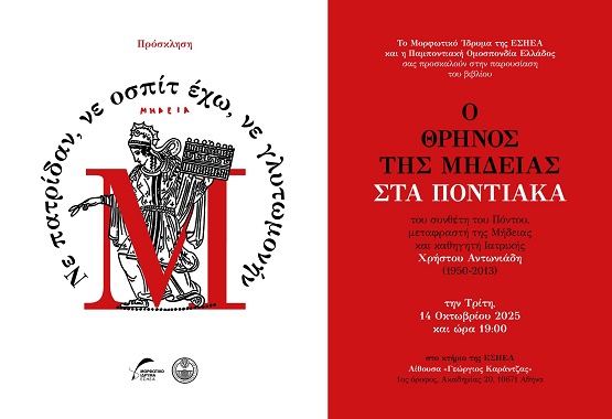 Στην εκδήλωση θα παρουσιαστεί για πρώτη φορά στο κοινό το βιβλίο του Χρήστου Αντωνιάδη: «ΜΗΔΕΙΑ. Η τραγωδία του Ευριπίδη στην Ποντιακή Διάλεκτο».