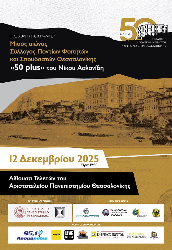 Τα 50 χρόνια από την ίδρυσή του γιορτάζει ο Σύλλογος Ποντίων Φοιτητών και Σπουδαστών Θεσσαλονίκης, με την προβολή του επετειακού ντοκιμαντέρ του Συλλόγου, «Μισός Αιώνας Σύλλογος Ποντίων Φοιτητών και Σπουδαστών Θεσσαλονίκης: 50 plus», σε παραγωγή δημοσιογράφου Νίκου Ασλανίδη, σε μία εκδήλωση που πραγματοποιείται την Παρασκευή 12 Δεκεμβρίου 2025, στις 19.30 μ.μ. στην Αίθουσα Τελετών του Αριστοτελείου Πανεπιστημίου Θεσσαλονίκης.
