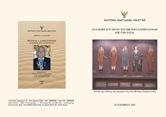 Η Επιτροπή Ποντιακών Μελετών σας προσκαλεί να τιμήσετε με την παρουσία σας την εκδήλωση, που διοργανώνει την Κυριακή 30 Νοεμβρίου 2025 και ώρα 11:00, στην αίθουσα εκδηλώσεών της, με θέμα: Ανάδειξη του έργου του Βίκτορα Σαρηγιαννίδη από την Ε.Π.Μ. Θα παρουσιαστούν η έκθεση η αφιερωμένη στον Βίκτορα Σαρηγιαννίδη και το βιβλίο του Χρήστου Ι. Γαλανίδη «Βίκτορας Ι. Σαρηγιαννίδης "Ο ποιητής της αρχαιολογίας».