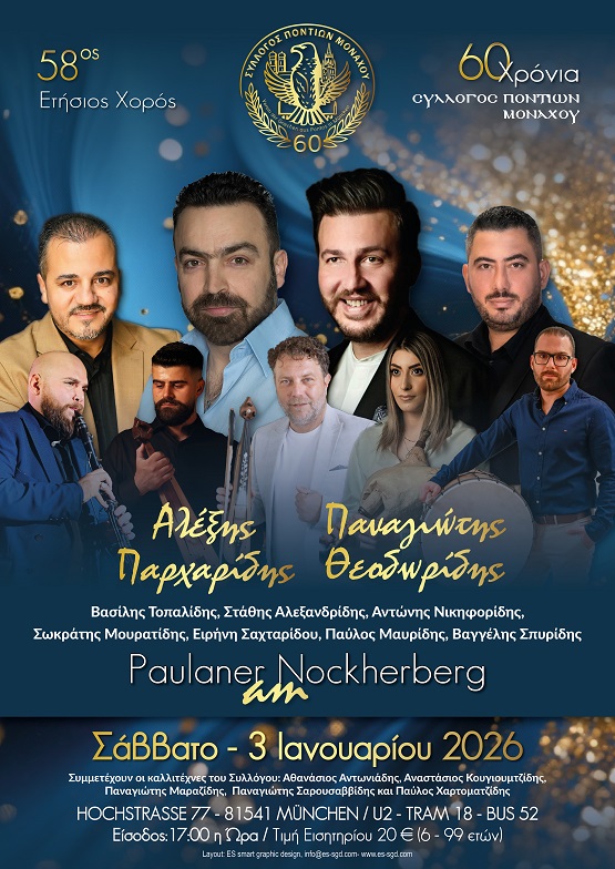Ο Σύλλογος Ποντίων Μονάχου όπως και κάθε χρόνο διοργανώνει και φέτος την καθιερωμένη και μεγαλύτερη μουσικοχορευτική του εκδήλωση που θα πραγματοποιηθεί το Σάββατο 3 Ιανουαρίου 2026 και ώρα 17.00. Χώρος Paulaner am Nockherberg. Διεύθυνση: Hochstrase 77, 91541, Munchen. Τιμή εισιτηρίου, 20 ευρώ.