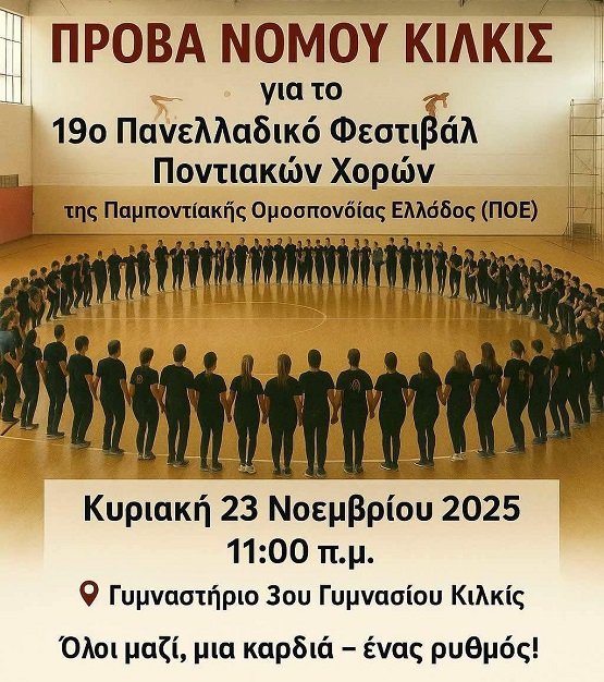 Την Κυριακή 23 Νοεμβρίου 2025, στις 11 το πρωί, στο Γυμναστήριο του 3ου Γυμνασίου Κιλκίς, θα γίνει πρόβα του νομού Κιλκίς, του Συνδέσμου Ποντιακών Σωματείων (ΣΠΟΣ) Κεντρικής Μακεδονίας και Θεσσαλίας της Παμποντιακής Ομοσπονδίας Ελλάδος (ΠΟΕ).