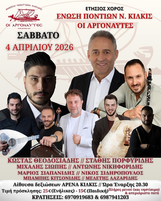 Τον ετήσιο χορό της πραγματοποιεί η Ένωση Ποντίων Ν. Κιλκίς «Οι Αργοναύτες» το βράδυ του Σαββάτου 4 Απριλίου 2026 σε κοσμικό κέντρο του Κιλκίς, με πλούσιο καλλιτεχνικό πρόγραμμα, και τη συμμετοχή των χορευτικών που θα παρουσιάσουν τους ποντιακούς χορούς στο κοινό.