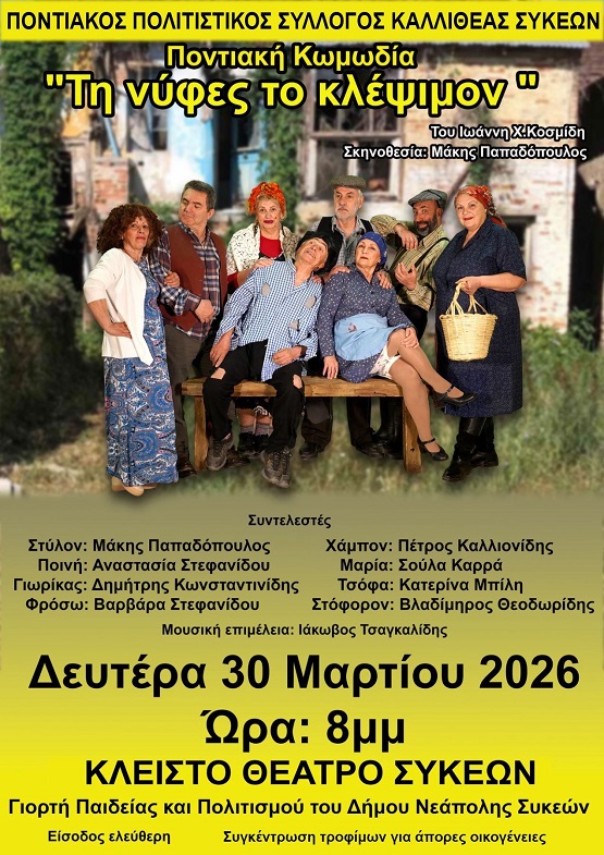 Την ποντιακή κωμωδία «Τη νύφες το κλέψιμον» του Ιωάννη Χ. Κοσμίδη, ανεβάζει η θεατρική ομάδα του Ποντιακού Πολιτιστικού Συλλόγου Καλλιθέας Συκεών την Δευτέρα 30 Μαρτίου 2026, στις 8 το βράδυ στο Κλειστό Θέατρο Συκεών (Μεγάρων 6 στις Συκιές), με ελεύθερη είσοδο για το κοινό, ενώ όλοι όσοι ενδιαφέρονται μπορούν να φέρουν τρόφιμα προκειμένου να διατεθούν σε άπορες οικογένειες.