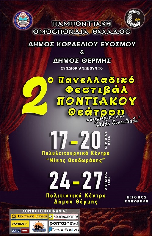Η Παμποντιακή Ομοσπονδία Ελλάδος ανακοινώνει την συνδιοργάνωση του 2ου Πανελλαδικού Φεστιβάλ Ποντιακού Θεάτρου με 2 Δήμους της Θεσσαλονίκης, τον Δήμο Κορδελιού Ευόσμου 17-20 Aπριλίου 2026 και τον Δήμο Θέρμης 24-27 Απριλίου 2026, όπου θα συμμετάσχουν 10 ερασιτεχνικά ποντιακά θεατρικά σχήματα από όλη την Ελλάδα.