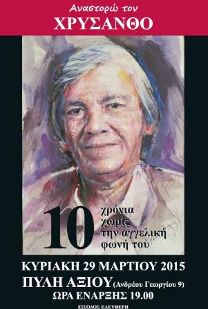 Εκδήλωση με αφορμή τη συμπλήρωση 10 χρόνων από το θάνατο του μεγάλου τραγουδιστή Χρύσανθου Θεοδωρίδη θα πραγματοποιηθεί την Κυριακή 29 Μαρτίου 2015 και ώρα 7 το απόγευμα, στην ΠΥΛΗ ΑΞΙΟΥ (Ανδρέου Γεωργίου 9 - Θεσσαλονίκη).