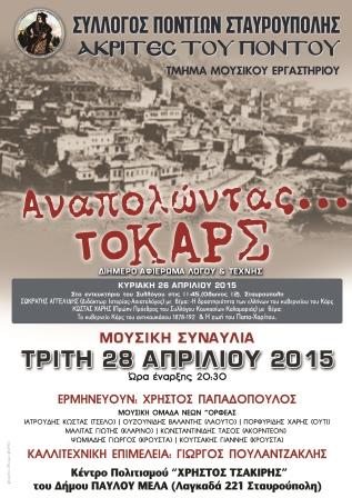 Το βράδυ της Τρίτης 28 Απριλίου 2015 στις 20.30 θα πραγματοποιηθεί μουσική συναυλία στο κέντρου πολιτισμού «Χρήστος Τσακίρης» του δήμου Παύλου Μελά (Λαγκαδά 211, Σταυρούπολη), όπου θα ακουστούν τραγούδια από την περιοχή του Καρς. Ερμηνεύουν ο κορυφαίος Πόντιος τραγουδιστής Χρήστος Παπαδόπουλος, η μουσική ομάδα νέων «Ορφέας» και οι καλλιτέχνες Κώστας Ιατρούδης τσέλο, Βαλάντης Ουζουνίδης λαούτο, Χάρης Πορφυρίδης ούτι, Γιώργος Μαλίτας κλαρίνο, Τάσος Κωνσταντινίδης ακορντεόν, Γιώργος Ψωμιάδης κρουστά, Γιάννη Κουτσάκης κρουστά, ενώ την καλλιτεχνική επιμέλεια έχει ο Γιώργος Πουλαντζακλής.