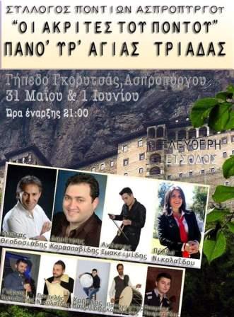 Σε διήμερο ποντιακό πανηγύρι στο πάρκο Γκορυτσάς, προσκαλεί το διοικητικό συμβούλιο του συλλόγου Ποντίων Ασπροπύργου «ΟΙ ΑΚΡΙΤΕΣ ΤΟΥ ΠΟΝΤΟΥ», την Κυριακή 31 Μαΐου 2015 και την Δευτέρα 1 Ιουνίου 2015 με αφορμή τον εορτασμό του Αγίου Πνεύματος.