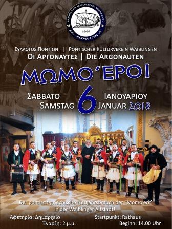 Το έθιμο των Μωμό’ερων θα παρουσιάσει στο Βαΐμπλινγκεν της Γερμανίας, ο σύλλογος Ποντίων Βαΐμπλινγκεν «Οι Αργοναύτες» στην ευρύτερη περιοχή της Στουτγάρδης του κρατιδίου της Βάδης Βυρτεμβέργης.
