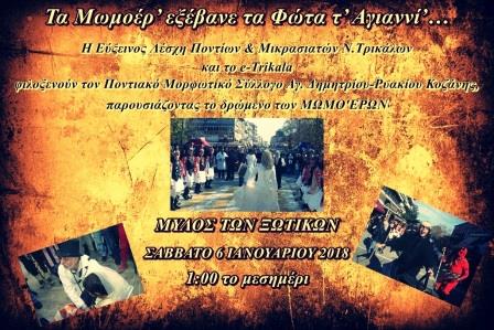 Το δρώμενο των «Μωμό’ερων», θα παρουσιάσει η Εύξεινος Λέσχη Ποντίων και Μικρασιατών νομού Τρικάλων και το e-Trikala, όπου θα φιλοξενήσουν τον ποντιακό Πολιτιστικό Μορφωτικό Σύλλογο Αγίου Δημητρίου - Ρυακίου Κοζάνης, το Σάββατο 6 Ιανουαρίου 2018, 1:00 το μεσημέρι, στο Μύλο των Ξωτικών.