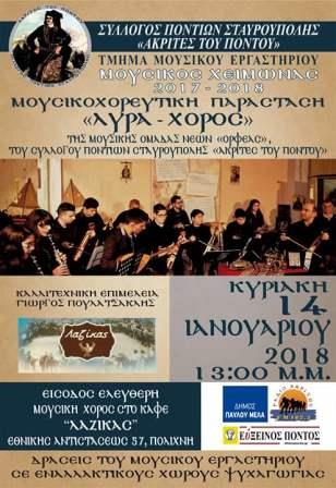 Το Μουσικό Εργαστήρι του συλλόγου Ποντίων Σταυρούπολης «Ακρίτες του Πόντου» σε συνέχεια της προσπάθειας του να «ανοίξει» τις δράσεις του σε εναλλακτικούς χώρους ψυχαγωγίας, καλεί την Κυριακή 14 Ιανουαρίου 2018, στην μουσικό - χορευτική παράσταση με τίτλο «Λύρα - Χορός», στις 13:00 το μεσημέρι, στο καφέ «ΛΑΖΙΚΑΣ» (Εθνικής Αντιστάσεως 57 Πολίχνη).
