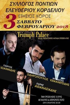 Ο ετήσιος χορός του συλλόγου Ποντίων Ελευθερίου – Κορδελιού θα πραγματοποιηθεί το Σάββατο 3 Φεβρουαρίου 2018, στην αίθουσα δεξιώσεων Triumph Palace (στο 14ο χιλιόμετρο της εθνικής οδού Θεσσαλονίκης – Λαγκαδά, όπισθεν του ΑΓΝΟ), και η ώρα έναρξης είναι στις 8 το βράδυ.