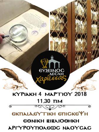Εκπαιδευτική επίσκεψη θα πραγματοποιήσει η Εύξεινος Λέσχη Χαρίεσσας, στα πλαίσια εκπαιδευτικών δράσεων της την Κυριακή 4 Μαρτίου 2018 στις 11:30 το πρωί, στην Εθνική Βιβλιοθήκη Αργυρουπόλεως, που στεγάζεται στο κτίριο της Ευξείνου Λέσχης Νάουσας (έπειτα από προγραμματισμένο ραντεβού).