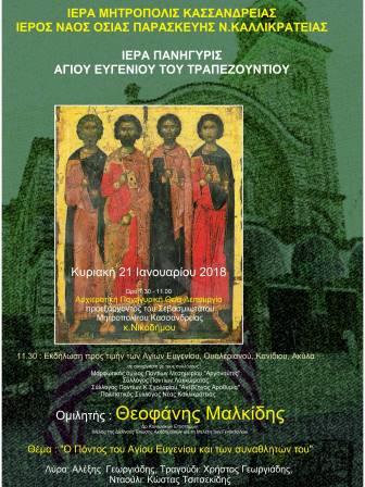 Στον Ιερό Ναό Οσίας Παρασκευής της Νέας, της Επιβατινής, εορτάστηκε η μνήμη του Αγίου Ευγενίου πολιούχου Τραπεζούντος και των συναθλητών του, Ακύλα, Ουαλεριανού, Κανίδιου, την Κυριακή 21 Ιανουαρίου 2018. Στην Πανηγυρική Θεία Λειτουργία, προεξάρχοντος του Σεβασμιωτάτου Μητροπολίτη Κασσανδρείας Νικοδήμου τον οποίον πλαισίωνε πλήθος ιερέων και πολυπληθές εκκλησίασμα, ετέθη προς προσκύνηση τεμάχιο ιερού λειψάνου του Αγίου Ευγενίου του οποίου η μυροβλησία έγινε αντιληπτή από πολλούς πιστούς.