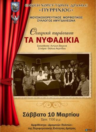 Τη θεατρική παράσταση «ΤΑ ΝΥΦΑΔΙΚΙΑ», σε σκηνοθεσία Αντώνη Βαγενά και σενάριο Θάλειας Ακριτίδου, θα παρουσιάσει η Ένωση Χορευτών Νομού Δράμας «ΠΥΡΡΙΧΟΣ», σε συνεργασία με τον μουσικοχορευτικό μορφωτικό σύλλογο Αμυγδαλεώνα.