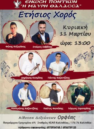 Τον ετήσιο χορό της διοργανώνει την Κυριακή 11 Μαρτίου 2018, στη 1 το μεσημέρι στην Καλλιθέα Αττικής, η Ένωση Ποντίων Νέας Σμύρνης – Δάφνης – Αγίου Δημητρίου «Η ΜΑΥΡΗ ΘΑΛΑΣΣΑ» και προσκαλεί τα μέλη και τους φίλους του συλλόγου να πάρουν μέρος.