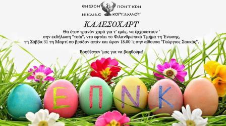 Σε απογευματινό τσάι, συνοδευόμενο από κεράσματα που ετοιμάζουν οι φίλες της Ένωσης Ποντίων Νίκαιας – Κορυδαλλού, προσκαλεί τα μέλη και τους φίλους του συλλόγου, το Φιλανθρωπικό Τμήμα της Ένωσής.