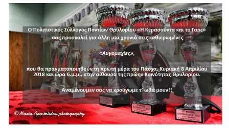 Τις καθιερωμένες «Αυγομαχίες», θα πραγματοποιήσει τη πρώτη μέρα του Πάσχα, Κυριακή 8 Απριλίου 2018 και ώρα 6.00 μ.μ., στην αίθουσα της πρώην Κοινότητας Θρυλορίου, ο πολιτιστικός σύλλογος Ποντίων Θρυλορίου «Η Κερασούντα και το Γαρς» και προσκαλεί όλους τους ενδιαφερομένους να πάρουν μέρος με το σύνθημα «Αναμένουμεν σας να κρούγωμε τ’ ωβά μουν!».