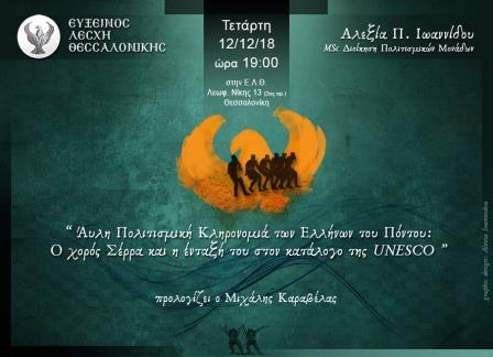 Μια σημαντική διάλεξη με θέμα «Άυλη Πολιτισμική Κληρονομιά των Ελλήνων του Πόντου: Ο χορός Σέρρα και η ένταξή του στον κατάλογο της UNESCO», θα πραγματοποιήσει η Αλεξία Π. Ιωαννίδου MSc Διοίκηση Πολιτισμικών Μονάδων, σε μία εκδήλωση που διοργανώνει η Εύξεινος Λέσχη Θεσσαλονίκης, την Τετάρτη 12 Δεκεμβρίου 2018, στις 7 το βράδυ.
