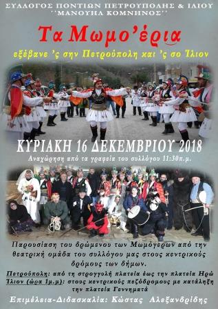 Στους δρόμους και τις πλατείες θα βγουν οι Μωμόγεροι την Κυριακή 16 Δεκεμβρίου 2018, με πρωτοβουλία της θεατρικής ομάδας του συλλόγου Πετρούπολης και Ιλίου «Μανουήλ Κομνηνός», για να παρουσιάσουν το εθιμικό δρώμενο που η προέλευσή του χάνεται στα βάθη του χρόνου και που διάσωσαν οι Έλληνες του Πόντου ανά τους αιώνες και το έφεραν μαζί τους μετά τον ξεριζωμό από τα άγια χώματα του Πόντου.