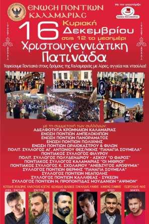 Με τον τίτλο Χριστουγεννιάτικη Πατινάδα, χορεύουμε ποντιακά στους δρόμους της Καλαμαριάς με λύρες, αγγεία και νταούλια, την Κυριακή 16 Δεκεμβρίου στις 12 το μεσημέρι, η Ένωση Ποντίων Καλαμαριάς με την υποστήριξη του δήμου Καλαμαριάς, θα ξεχυθούν στους δρόμους και της πλατείες της προσφυγομάνας, εκεί όπου έφτασαν οι πρόσφυγες της γενοκτονίας των Ελλήνων του Πόντου και της ανταλλαγής της Συνθήκης της Λωζάνης, για να παρουσιάσουν στο κοινό έναν πολιτισμό χιλιάδων χρόνων, που έφεραν μαζί τους στις αποσκευές τους, οι πρόσφυγες πρόγονοί μας.