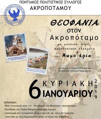 Στην ανακοίνωσή του ο ποντιακός πολιτιστικός σύλλογος Ακροποτάμου, την οποία εκ μέρους του διοικητικού συμβουλίου υπογράφουν ο πρόεδρος Παναγιώτης Δουλκερίδης και ο γενικός γραμματέας Χαρίλαος Λιβάρδας, «προσκαλούν στην εκδήλωση που διοργανώνει ο σύλλογος για τον εορτασμό των Θεοφανίων, την Κυριακή 6 Ιανουαρίου 2109. Τα Θεοφάνια είναι μεγάλη ετήσια χριστιανική εορτή της Βάπτισης του Ιησού Χριστού στον Ιορδάνη ποταμό από τον Άγιο Ιωάννη τον Βαπτιστή. Εορτάζεται στις 6 Ιανουαρίου και είναι η τρίτη και τελευταία εορτή του Δωδεκαημέρου.