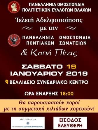 Σύμφωνα με κοινή ανακοίνωση των Πανελλήνιας Ομοσπονδίας Ποντιακών Σωματείων (ΠΟΠΣ) και της Πανελλήνιας Ομοσπονδίας Πολιτιστικών Συλλόγων Βλάχων (ΠΟΠΣΒ), την οποία εκ μέρους των διοικητικών συμβουλίων υπογράφουν οι πρόεδροι Χριστίνα Σαχινίδου και Μιχάλης Μαγειρίας, «με μία επίσημη τελετή αδελφοποίησης, η Πανελλήνια Ομοσπονδία Ποντιακών Σωματείων και η Πανελλήνια Ομοσπονδία Πολιτιστικών Συλλόγων Βλάχων πρόκειται να επισφραγίσουν τους ισχυρούς δεσμούς φιλίας που τις συνδέουν. Η τελετή αδελφοποίησης και η κοπή πίτας που θα ακολουθήσει, θα πραγματοποιηθούν το Σάββατο 19 Ιανουαρίου 2019 και ώρα 18:00, στο Συνεδριακό Κέντρο «Ι. Βελλίδης» στη Θεσσαλονίκη.