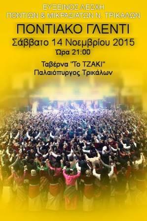 Ποντιακή βραδιά διοργανώνει σήμερα Σάββατο 14 Νοεμβρίου 2015, στις 9 το βράδυ, η Εύξεινος Λέσχη Ποντίων και Μικρασιατών νομού Τρικάλων και καλεί τα μέλη και τους φίλους του συλλόγου, στις 9 το βράδυ στην ταβέρνα «ΤΟ ΤΖΑΚΙ» στον Παλαιόπυργο Τρικάλων.