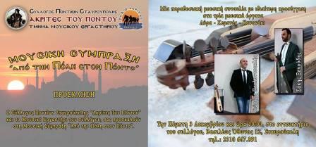 Ο σύλλογος Ποντίων Σταυρούπολης «Ακρίτες του Πόντου» και το Μουσικό Εργαστήρι του συλλόγου, προσκαλούν μέλη και φίλους του συλλόγου, αλλά και όλους τους Θεσσαλονικείς και τους κατοίκους της Μακεδονίας, να παρευρεθούν σε μία μουσική πανδαισία, στη μουσική σύμπραξη με τίτλο «Από την Πόλη στον Πόντο».