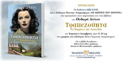 Το βιβλίο του Θοδωρή Δεύτου, «Τραπεζούντα: το διαμάντι της Ανατολής», θα παρουσιαστεί από τον σύλλογο Ποντίων Ασπροπύργου «Οι Ακρίτες του Πόντου», και τις εκδόσεις Ωκεανός, την Κυριακή 6 Δεκεμβρίου 2015 στις 11.30 στα γραφεία του συλλόγου, θέση Γκορυτσά, στον Ασπρόπυργο.