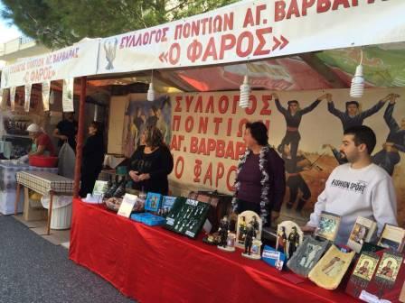 Η πόλη, της Αγίας Βαρβάρας Αττικής γιόρτασε στις 4 Δεκέμβρη. Σε αυτό το μεγάλο πανηγύρι δεν θα μπορούσε να λείπει και μάλιστα με δυναμική παρουσία ο σύλλογος Ποντίων Αγίας Βαρβάρας «Ο ΦΑΡΟΣ» με το δικό του περίπτερο, στο πλαίσιο των εκδηλώσεων της πόλης, που έγιναν στις 3 και τις 4 Δεκέμβρη 2015.