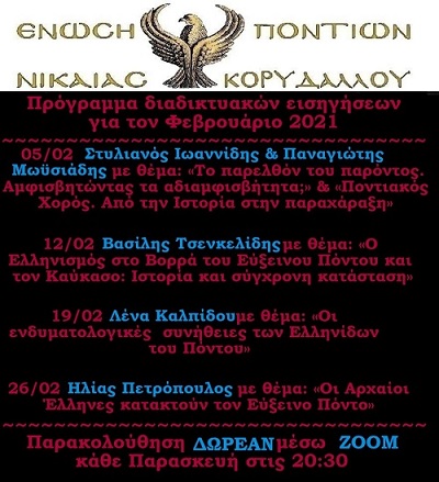 Τους ομιλητές και τα θέματα των διαδικτυακών εισηγήσεών τους, που πραγματοποιούνται κάθε Παρασκευή, ανακοίνωσε η Ένωση Ποντίων Νίκαιας – Κορυδαλλού, για το μήνα Φεβρρουάριο του 2021.