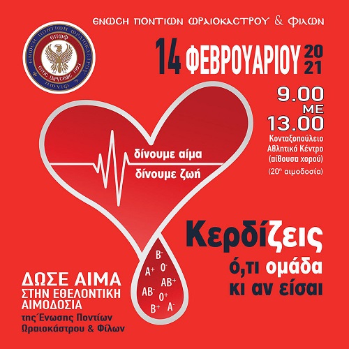 Η αιμοδοσία της Ένωσης Ποντίων Ωραιοκάστρου και Φίλων θα πραγματοποιηθεί την Κυριακή 14/02/2021 από τις 9:00 ως τη 13:00 στη αίθουσα χορού (ξύλινο πάτωμα) απέναντι από τα γραφεία του Συλλόγου μας στο Κονταξοπούλειο.