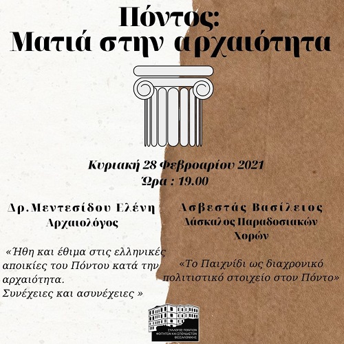 Διαδικτυακή εσπερίδα με θέμα «Πόντος: Ματιά στην Αρχαιότητα», με ομιλητές την αρχαιολόγο Δρ. Ελένη Μεντσεσίδου και τον δάσκαλο παραδοσιακών χορών Βασίλη Ασβεστά, πραγματοποιεί ο Σύλλογος Ποντίων Φοιτητές και Σπουδαστών Θεσσαλονίκης.