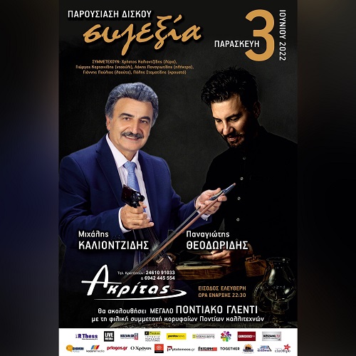 Το νέο μουσικό άλμπουμ «συζεξία», παρουσιάζουν την Παρασκευή 3 Ιουνίου 2022 και ώρα 22.30 το βράδυ, στον ΑΚΡΙΤΑ, στα Αλωνάκια Κοζάνης, ο Παναγιώτης Θεοδωρίδης και ο Μιχάλης Καλιοντζίδης.