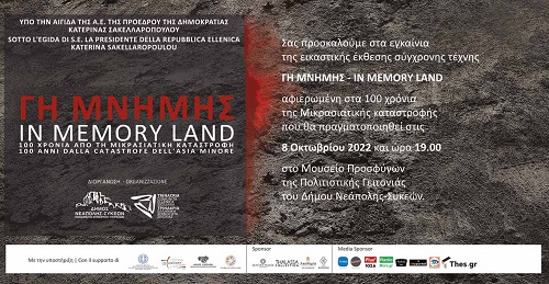 H Έκθεση Σύγχρονης Τέχνης υπό τον τίτλο «Γη Μνήμης - In Memory Land», με αφορμή τη συμπλήρωση 100 χρόνων από τη Μικρασιατική Καταστροφή, η οποία τελεί υπό την αιγίδα της Α.Ε. της Πρόεδρου της Δημοκρατίας Κατερίνας Σακελλαροπούλου αναμένεται να αποτελέσει κορυφαίο πολιτιστικό γεγονός της Θεσσαλονίκης κατά την περίοδο 8 Οκτωβρίου - 8 Δεκεμβρίου 2022.