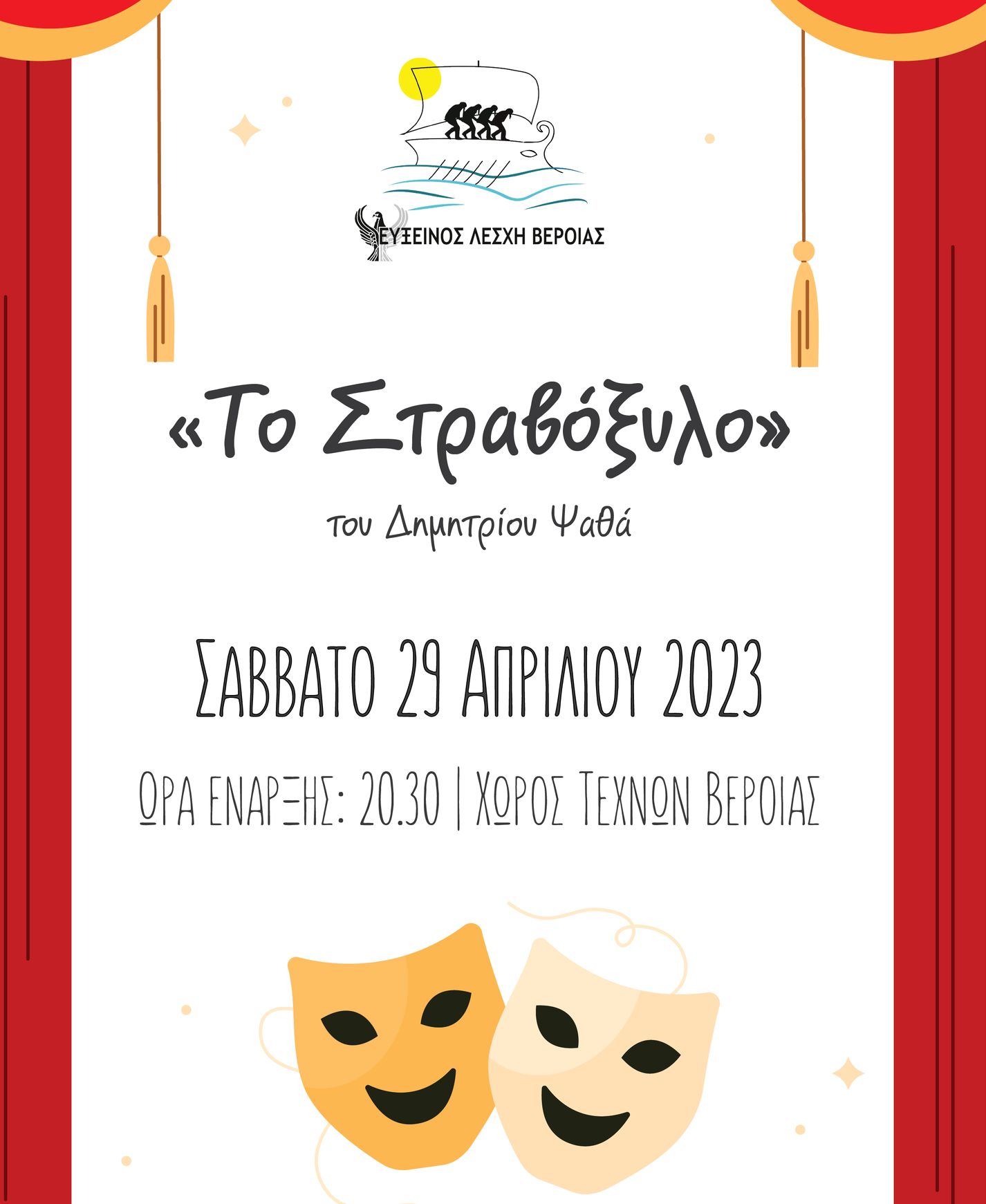 Η Εύξεινος Λέσχη Βέροιας, το Σάββατο 29 Απριλίου 2023 και ώρα 20:30, θα παρουσιάσει στο Χώρο Τεχνών του Δήμου Βέροιας,την ποντιακή θεατρική παράσταση με τίτλο, «Το στραβόξυλον», σε σκηνοθεσία του Λευτέρη Τσαχουρίδη, με τη συμμετοχή του θεατρικού της τμήματος της Λέσχης.