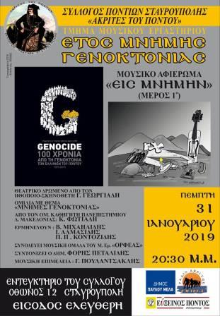 Ένα μουσικό αφιέρωμα για τη γενοκτονία των Ελλήνων του Πόντου, με τον γενικό τίτλο «Εις Μνήμην…», θα πραγματοποιηθεί από το σύλλογο Ποντίων Σταυρούπολης «Ακρίτες του Πόντου» και το μουσικό εργαστήρι του συλλόγου, με το οποίο θα αρχίσει ένας νέος κύκλος μουσικών παραστάσεων και διαλέξεων, που εντάσσονται στο πλαίσιο των εκδηλώσεων μνήμης του Έτους Γενοκτονίας, καθώς συμπληρώνονται φέτος 100 χρόνια από την αποβίβαση του γενοκτόνου Κεμάλ πασά στην Αμισό, όπου ξεκίνησε η τελική βάση της γενοκτονίας.