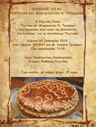 Στην κοπή της πρωτοχρονιάτικης βασιλόπιτας προχωράει η Εύξεινος Λέσχη Ποντίων και Μικρασιατών Νομού Τρικάλων και προσκαλεί τα μέλη και τους φίλους του συλλόγου, να παρευρεθούν και στη συνέχεια να γλεντήσουν ποντιακά.