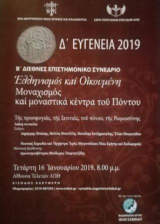 Λαϊκή συναυλία με θέμα τραγούδια «Της Προσφυγιάς, της Ξενιτιάς, του Πόνου, της Ρωμιοσύνης», διοργανώνει η Ιερά Μητρόπολη Νέας Κρήνης και Καλαμαριάς, στο πλαίσιο του θεσμού «Δ΄ Ευγένεια 2019», η οποία πραγματοποιείται με τις με τις ευλογίες του Σεβασμιωτάτου Μητροπολίτου Νέας Κρήνης και Καλαμαριάς, κ. Ιουστίνου, την Τετάρτη, 16 Ιανουαρίου 2019 και ώρα 8 μ.μ. στην Αίθουσα Τελετών του Αριστοτελείου Πανεπιστημίου Θεσσαλονίκης.