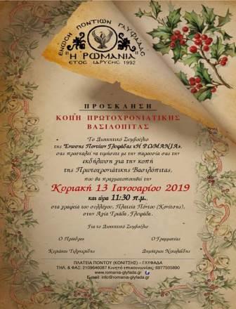 Την πρωτοχρονιάτικη βασιλόπιτά της κόβει η Ένωση Ποντίων Γλυφάδας «Η Ρωμανία», την Κυριακή 13 Ιανουαρίου 2019, στις 11.30 το πρωί, στην αίθουσα των γραφείων του συλλόγου, στην πλατεία Πόντου (πρώην Κονίτσης) στην Αγία Τριάδα, στη Γλυφάδα στην Αττική.