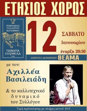 Τον ετήσιο χορό του διοργανώνει ο ποντιακός σύλλογος Κατερίνης «Παναγία Σουμελά», το Σάββατο 12 Ιανουαρίου 2019, ο οποίος επρόκειτο να γίνει το Σάββατο 5 Ιανουαρίου 2019 και είχε αναβληθεί λόγω της σφοδρής κακοκαιρίας που έπληττε την Ελλάδα και το διοικητικό συμβούλιο του συλλόγου με ανακοίνωσή του προσκαλεί τα μέλη και τους φίλους του συλλόγου, να βρεθούν όλοι μαζί στις αρχές του χρόνου και να γλεντήσουν παραδοσιακά ποντιακά.