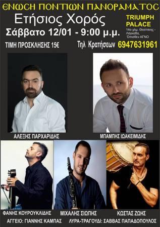 Τον ετήσιο χορό της, διοργανώνει η Ένωση Ποντίων Πανοράματος, το Σάββατο 12 Ιανουαρίου 2019, και το διοικητικό συμβούλιο του συλλόγου, προσκαλεί τα μέλη και τους φίλους του συλλόγου να παρευρεθούν και να γλεντήσουν στους ήχους και τα χρώματα του αλησμόνητου Πόντου.