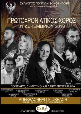 Τον πρωτοχρονιάτικο χορό του διοργανώνει ο σύλλογος Ποντίων Schorndorf την παραμονή της Πρωτοχρονιάς 31 Δεκεμβρίου 2018, υποσχόμενος ένα πλούσιο ποντιακό, παραδοσιακό και λαϊκό πρόγραμμα.