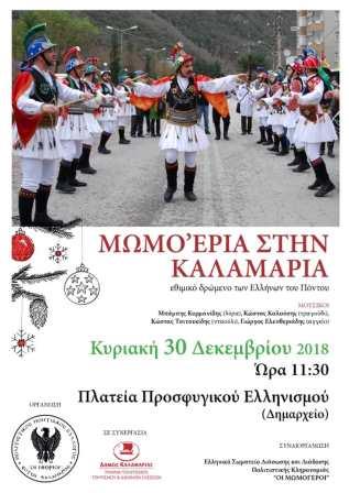 Τα Μωμο’ερια εξέβανε σην Καλαμαριάν. Την Κυριακή 30 Δεκεμβρίου 2018, στις 11.30 το πρωί στην πλατεία προσφυγικού ελληνισμού (δημαρχείο) στην Καλαμαριά, ο πολιτιστικός ποντιακός σύλλογος Βότση –Καλαμαριάς «Οι Μίθριοι», με τη συνδιοργάνωση του ελληνικού σωματείου διάσωσης και διάδοσης της πολιτιστικής κληρονομίας «Οι Μωμόγεροι», και τη συνεργασία του δήμου Καλαμαριάς, θα παρουσιάσουν το έθιμο των Μωμόγερων, στην προσφυγομάνα Καλαμαριά.