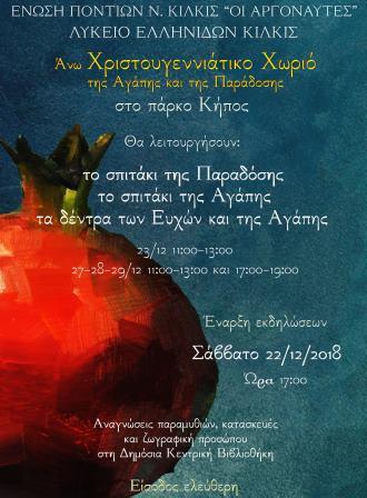 Για πρώτη χρονιά φέτος το Πάρκο - Κήπος του Κιλκίς αποκτά χριστουγεννιάτικο χρώμα και ρυθμό, με τις εορταστικές εκδηλώσεις και δράσεις που θα πραγματοποιήσουν από κοινού, το Λύκειο Ελληνίδων Κιλκίς και η Ένωση Ποντίων Ν. Κιλκίς «Οι Αργοναύτες», κατά το διάστημα από το Σάββατο 22 Δεκεμβρίου 2018 έως τις 2 Ιανουαρίου 2019.