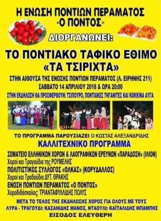 Το ποντιακό ταφικό έθιμο «Τα τσιριχτά», διοργανώνει η Ένωση Ποντίων Περάματος «Ο ΠΟΝΤΟΣ», στην αίθουσα του συλλόγου, (Λ. Ειρήνης 111), το Σάββατο 14 Απριλίου 2018, στις 8 το βράδυ.
