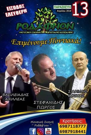 Ένα γνήσιο ποντιακό γλέντι υπόσχονται οι συντελεστές της μουσικής σκηνής «Ροδάφνον» στο Δρέπανο Κοζάνης, με σπουδαίους καλλιτέχνες της παράδοσης των Ελλήνων του Πόντου, το βράδυ της Παρασκευής 13 Απριλίου 2018.