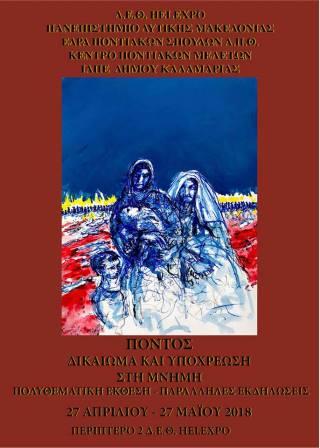 Ολοκληρώθηκε το πρόγραμμα της πολυθεματικής έκθεσης «Πόντος. Δικαίωμα και υποχρέωση στη μνήμη», και των παράλληλων εκδηλώσεων που διοργανώνει ο ομότιμος καθηγητής Κωνσταντίνος Φωτιάδης, από την Παρασκευή 27 Απριλίου 2018 έως την Κυριακή 27 Μαΐου 2018, και θα πραγματοποιηθεί στο περίπτερο 2 της ΔΕΘ – Helexpo, σε συνεργασία με το πανεπιστήμιο Δυτικής Μακεδονίας, την Έδρα Ποντιακών Σπουδών, το Κέντρο Ποντιακών Μελετών και το Ιστορικό Αρχείο Προσφυγικού Ελληνισμού του δήμου Καλαμαριάς.